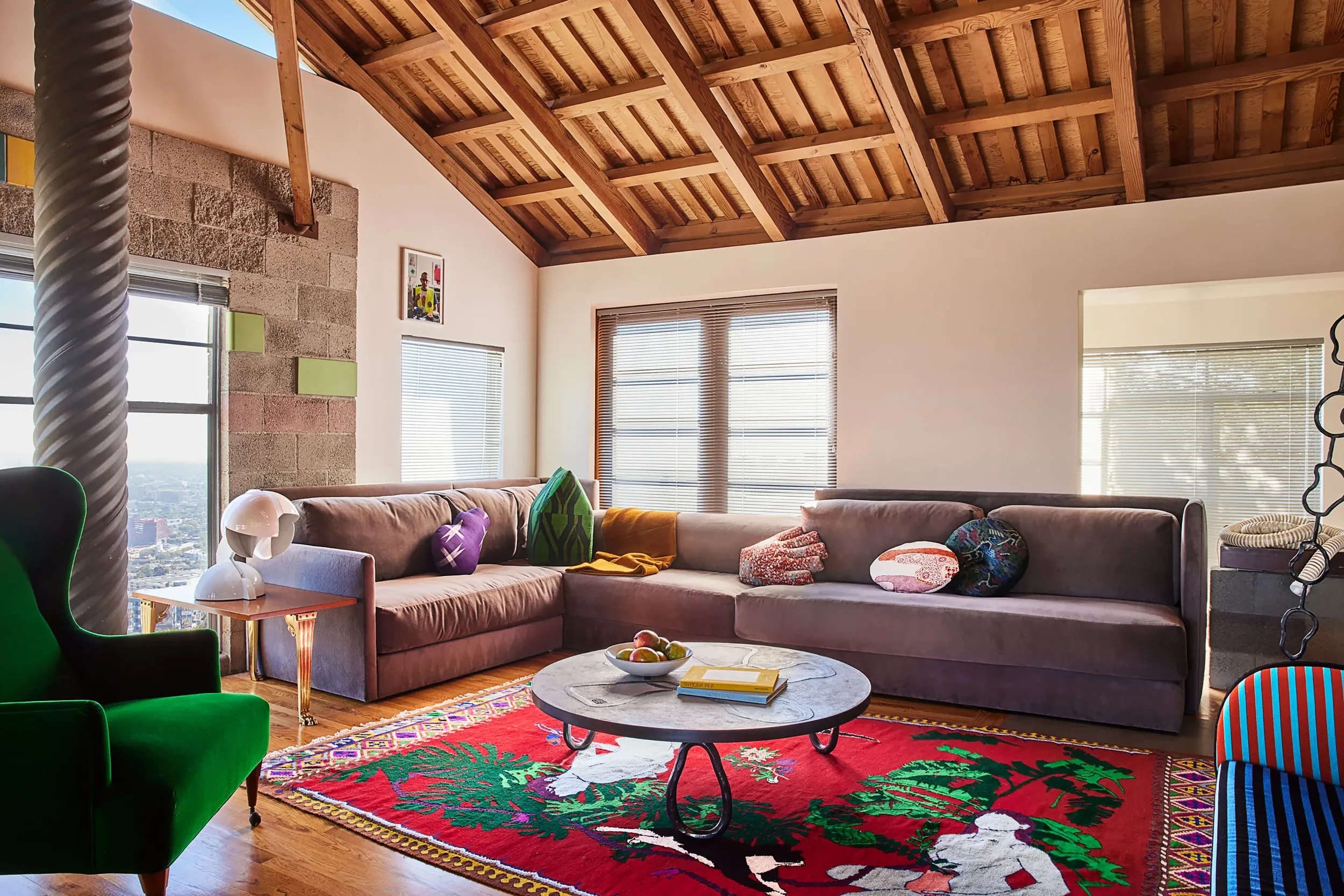 Qilim: Untitled (here and there, I remember, we remember our past, to present self) (2023), in collaboration with elder weavers, crafted in Krujë, Albania. Featured on Architectural Digest: Inside a Quintessential LA Compound Floating Above the City Streets
